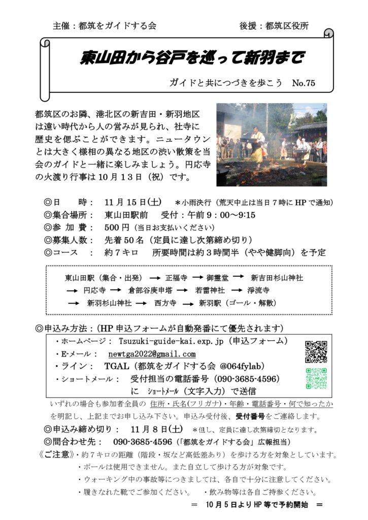 TGA75「東山田から谷戸を巡って新羽まで」を11月15日(土)に開催します。丘の上り下りがありやや健脚向きですが、昔の面影が残る渋い谷戸巡りが魅力です。新吉田・新羽の由緒ある寺社も訪ねます。(立ち寄り先の円応寺の火渡り修行は10月13日予定デス。) 本HPのイベント参加申込フォーム(受付番号が自動発番されてお手元端末に届きます)からのお申込みが便利です。by GuideTsuzuki2025年10月5日2025年10月1日