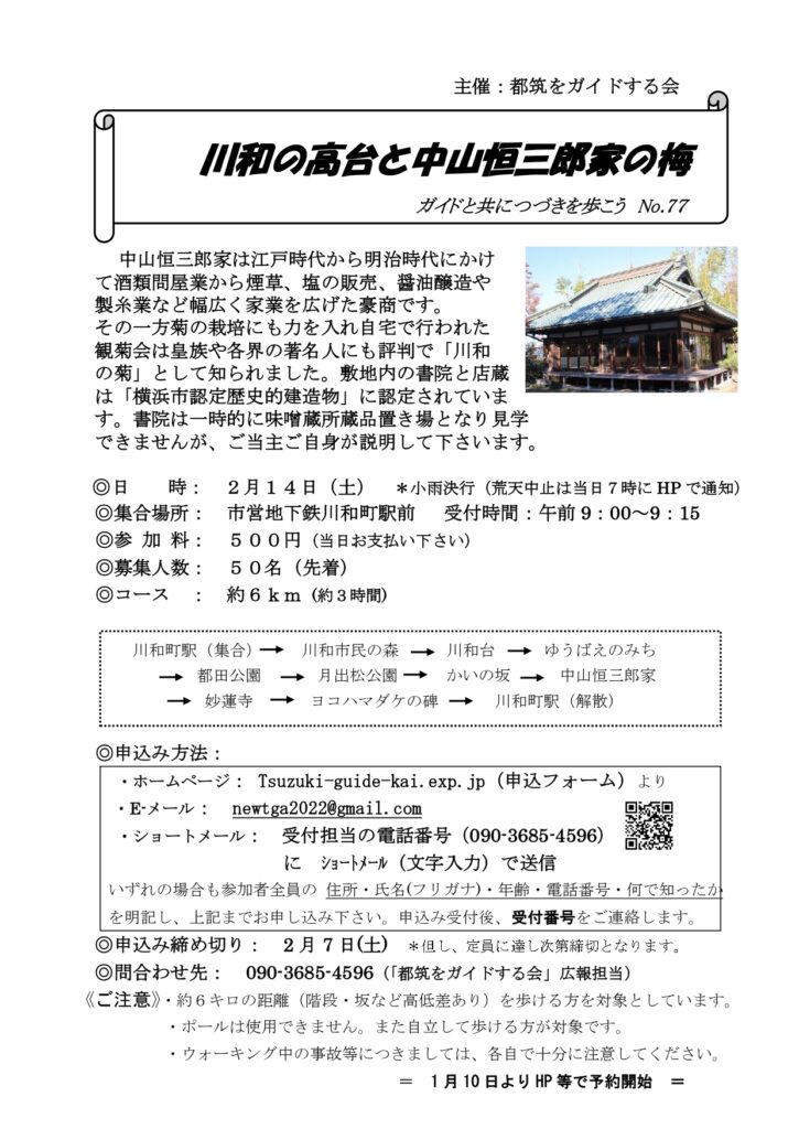 新年おめでとうございます。今年の最初のイベントは2月14日(土)開催のNo.77「川和の高台と中山恒三郎家の梅」です。ご当主自ら歴史的建造物のご説明と庭園のご案内をして下さいます。本HPの参加申込フォーム(受付番号が自動発番されて返信されます)他でお申込み下さい。詳しくは添付のチラシをご覧下さい。by GuideTsuzuki2026年1月11日2026年1月10日