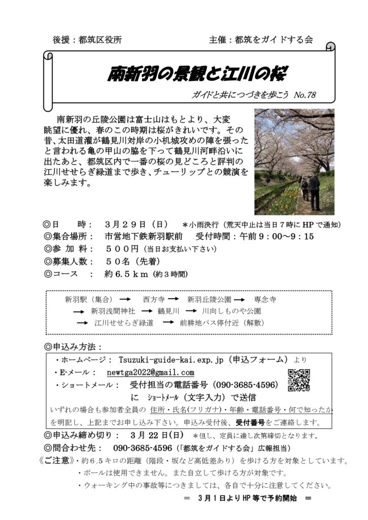 3月を迎え、花々に彩られる季節になりました。当会は3月29日(日)にTGA78「南新羽の景観と江川の桜」を開催します。都筑区内で一番の桜の見どころと言われる江川せせらぎ緑道でチューリップとの競演を楽しみます。本HPの「イベント申込フォーム」などからお申込み下さい。by GuideTsuzuki2026年3月1日2026年3月1日